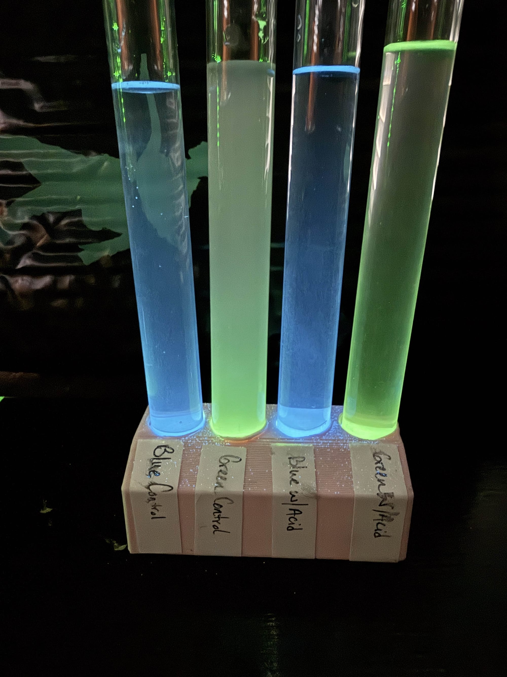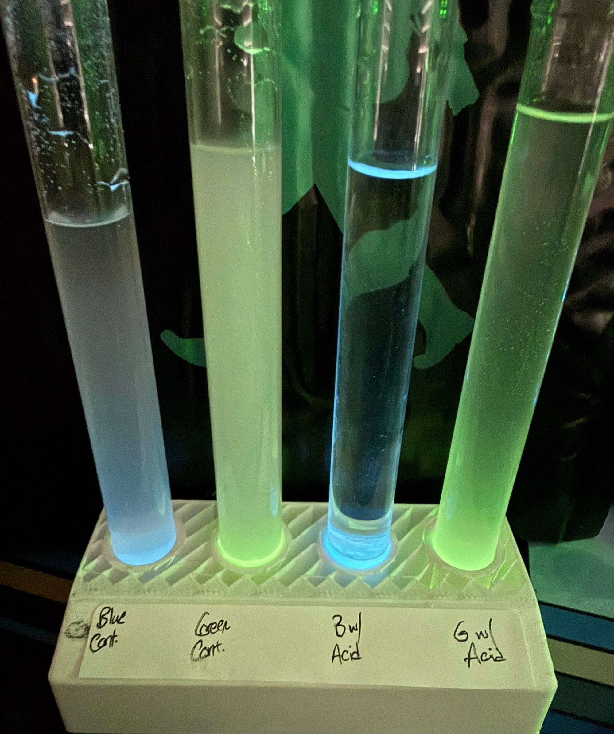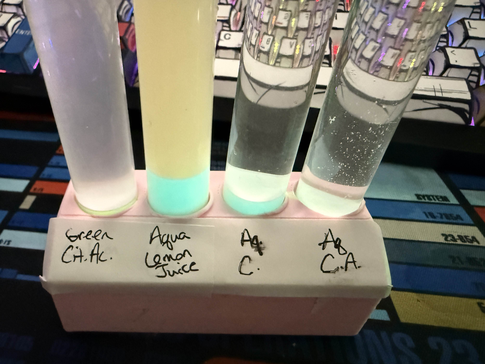 - Samples: Green, Aqua, and Blue photoluminescent powders.