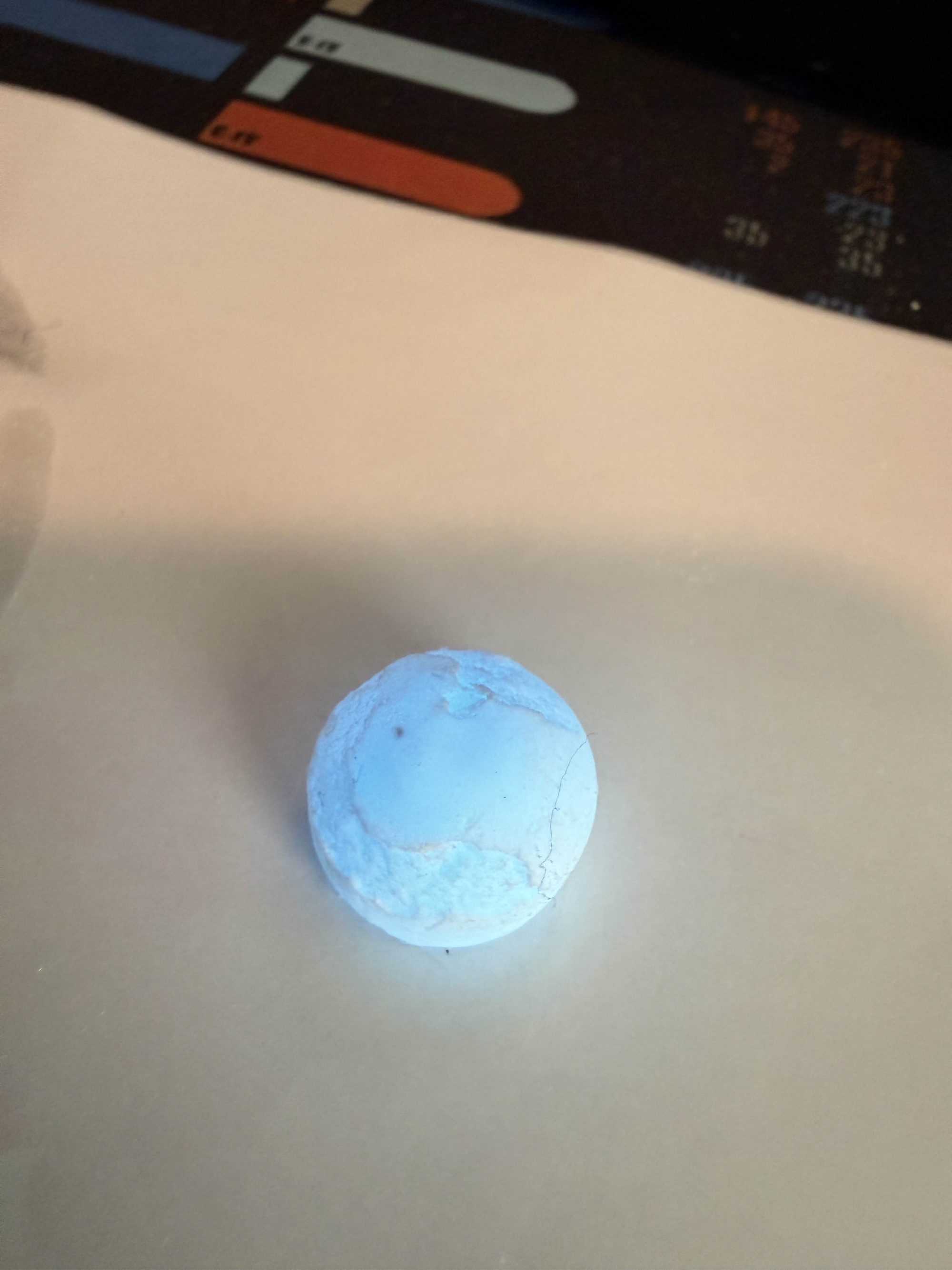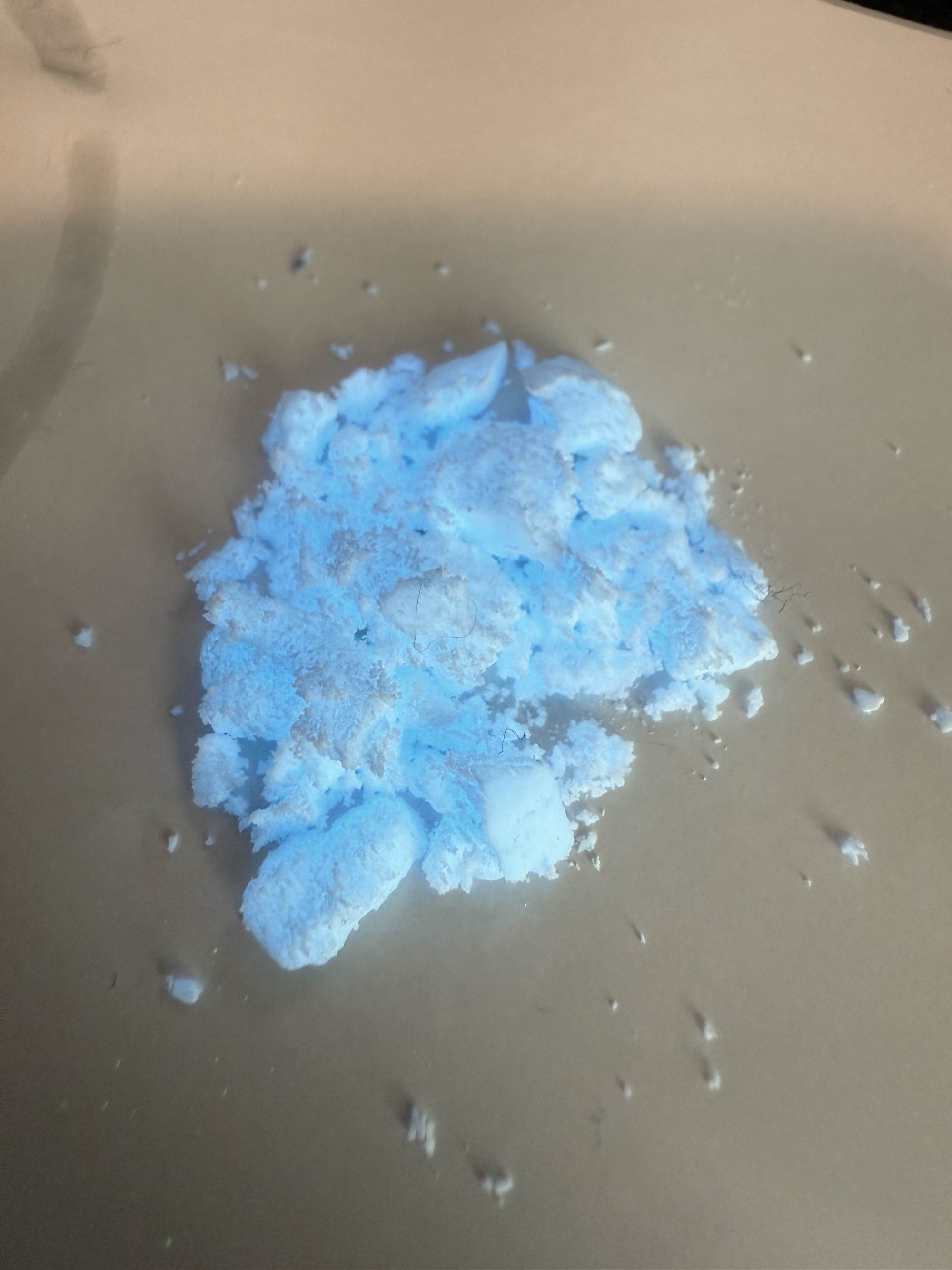 Within the citric acid solution, the Blue powder began to aggregate. By the end of the observation period, it had solidified into a solid, yet crushable mass.