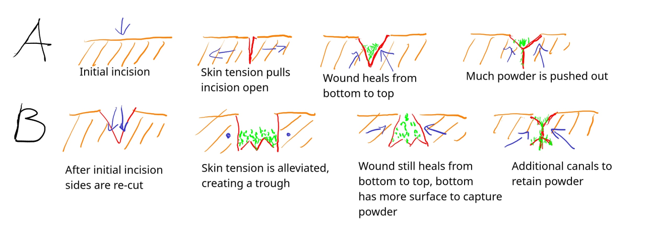 Once the location has been marked and the skin prepared, proceed to make the incision. Aim for a depth that reaches the hypodermis but doesn't go beyond. The goal will be to create a thin but deep cut without removing any skin. The scalpel blade can be run through it at an angle to widen the scar beneath the surface and create more space for the powder.