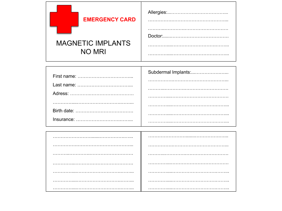 We strongly recommend carrying a medical emergency card with your medical info and a big ‘NO MRI’ with some details on your implants. Again, this is something doctors are used to (usually for serious allergies or diseases), and if you are ever brought to the hospital unconscious, they should look in your pockets for emergency contacts and IDs. You would commonly carry your medical card in your wallet, as this is one of the first things the emergency services will check. Note that printing and filling a basic template like this one in this post is sufficient.